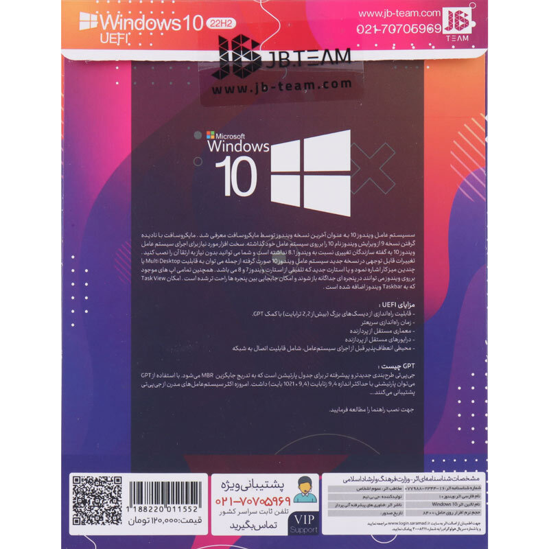 آیا آمادهاید برای ارتقاء تجربه کاربری خود؟ با ویندوز 10 نسخه 22H2، هماکنون به جدیدترین امکانات و امنیت بینظیر دست یابید. این محصول با پشتیبانی از UEFI و آماده برای سال 2025، روی یک DVD9 توسط JB.TEAM ارائه شده و نصب آسان و سریعی را برای شما به ارمغان میآورد. همین امروز خرید کنید و از تکنولوژی پیشرفته لذت ببرید!